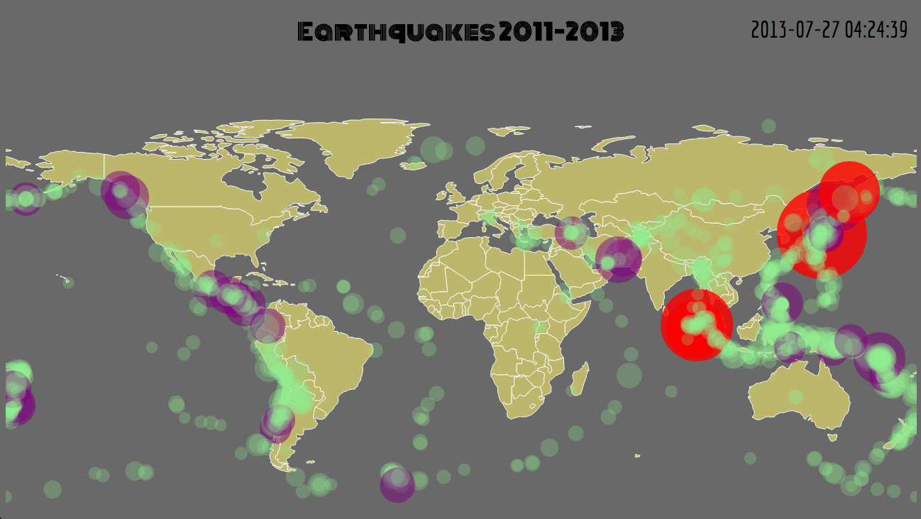 This is a 24hr D3 hack-a-thon project to visualize Earthquakes in the period of 2011-2013. This was a lot of fun to work on and really provides a great way to display tectonic plate activity in the world. Watch the whole thing to see the outline of the plates.