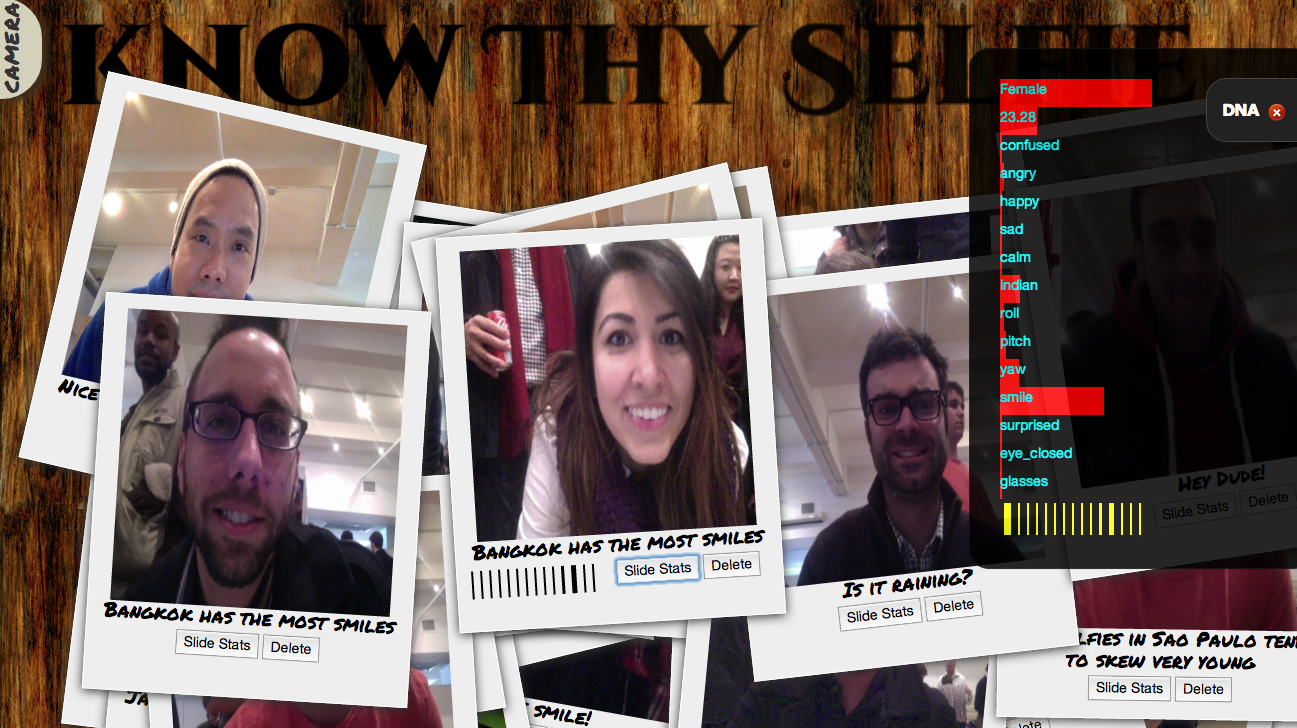 Know Thy Selfie is a app that lets you put your selfie through the digital wringer. We take your selfie and analyze it in the cloud then return your digital stats in the most advanced manner possible bringing you your personal digital DNA.