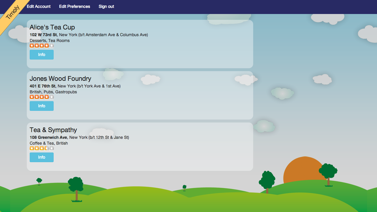 A mobile discovery tool, Timely pushes temporally curated selections Based on time of day, geolocation, and user preferences, Timely provides users with tailored service recommendations. Technology: HTML5 geolocation, Yelp API and Google Maps API.